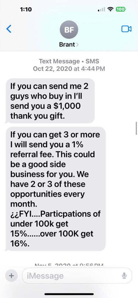 This is not just theoretical. Jason Shepherd received a series of texts from Cinco between 2019 and 2020, soliciting investments into First Liberty. The pitch started small, offering a $250 gift card for a referral. That increased to $500, and eventually Cinco was offering a full one percent commission for referred investments. He even suggested this could be a solid side business for Shepherd, claiming there were two or three of these opportunities each month.