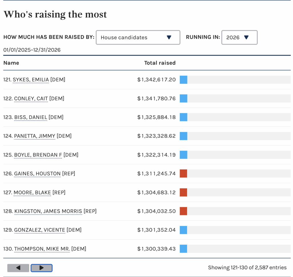 Houston Gaines, running for the open seat in Congressional District 10, and Jim Kingston, running for the open seat in Congressional District 1, rank 126th and 128th, respectively, in money raised for the 2026 cycle. This list includes incumbent members of Congress, many of whom have national fundraising profiles. Impressive work by these two campaigns.