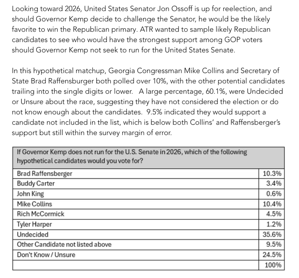 As the world wonders what Governor Kemp will do, Advanced Targeting Research polled Georgians to ask, among other things, who Republicans might pick to challenge Senator Jon Ossoff. As you might imagine, the field is wide open.