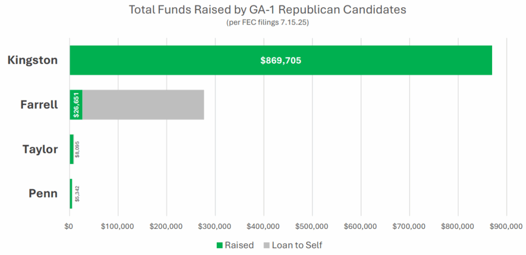 A finance memo that the Kingston campaign sent to supporters on July 18 laid out their first three weeks on the trail. It said Jim Kingston raised $869,705 in 21 days, with more than 80 percent of contributions coming from inside Georgia, including from every county in the district, and 40 percent from first-time federal donors. The memo’s summary line was blunt: Kingston was leading the field by large margins.