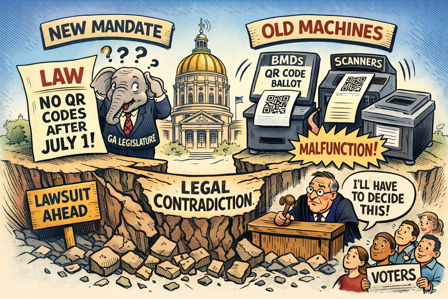 If no bill passes, the most likely result is litigation. Once SB 189’s July deadline takes effect, Georgia will be left with a legal framework that still contemplates the use of BMDs and scanners, while also forbidding the use of QR codes for the scanner’s official tabulation count. That kind of internal contradiction is almost certain to invite a lawsuit, because candidates, parties, counties, and outside groups will all have strong incentives to ask a court to decide what the law now requires. At that point, the issue is no longer being resolved by the legislature in a deliberate and transparent way. It is being handed to judges on an emergency basis, under the pressure of an election calendar, with counties and voters caught in the middle.